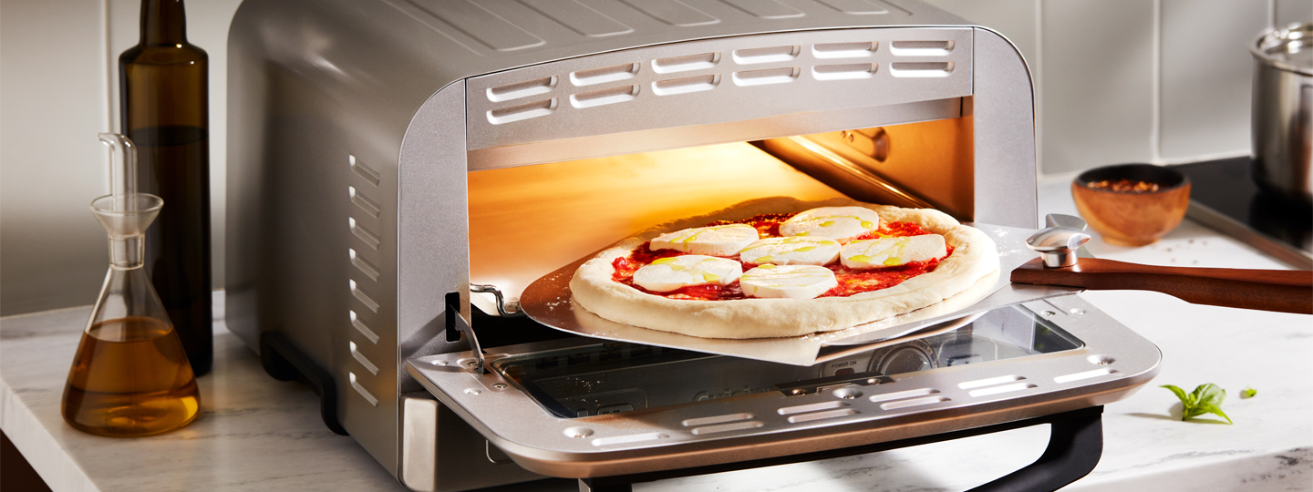 Elevate your pizza nights with the Cuisinart Indoor Pizza Oven, designed to bring restaurant-quality pizzas right to your countertop. Enjoy fresh, delicious pizzas in just 5 minutes with temperatures ranging from 170°C to 400°C, perfect for crafting any pizzas from classic Neapolitan to deep-dish and can also handle baked dishes like pasta and cakes.